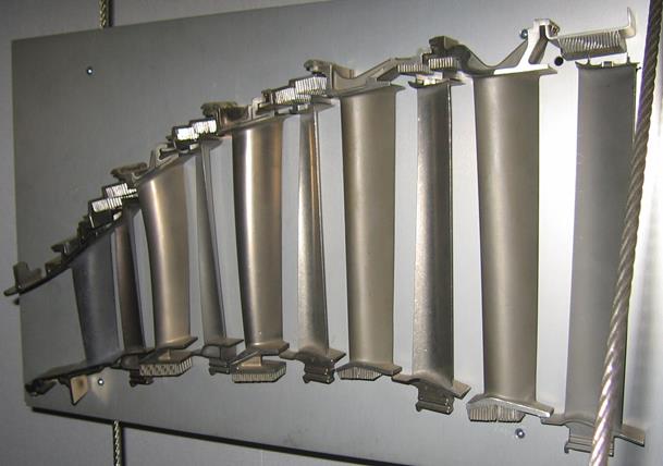 Рис. 5. 5. Сопловые и рабочие лопатки турбин на стенде в музее MTU