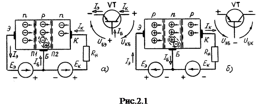Под действием источника Еэ основные носители заряда из эмиттера преодолевают n-p-переход и попадают в область базы, где частично рекомбинируют с основными носителями заряда базы, образуя ток базы Iб. Так как концентрация дырок (для n-p-n-типа) и электронов (для p-n-p-типа) в базе мала, то не все инжектированные из эмиттера заряды рекомбинируют. Большинство зарядов, вследствие диффузии и поля источника Ек, преодолевает коллекторный переход и образуют ток коллектора.