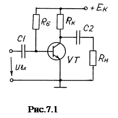 Каскад усиления переменного тока по схеме ОЭ построен на биполярном транзисторе n-p-n (рис.7.1). Расчет каскада сводится к выбору точки покоя на статической линии нагрузки, определению величин Rк и RБ по заданным параметрам нагрузки, например, Um вых и Rн, и напряжению источника питания Eк.