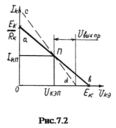 Линию нагрузки можно построить в координатах Iк, Uкэ по двум точкам. Одна из них - точка покоя П, координаты которой определены. Вторая может быть получена согласно уравнению - если принять Iк=0, то Uкэ=Eк. Построение статической линии нагрузки показано на рис.7.2 (линия ав).