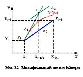 Через точку Рi(Xi,Yi) (мал. 5.2) проводиться дотична А1 з тангенсом кута нахилу f(Xi,Yi) до перетинання з ординатою в точці X=Xi + h/2 (по методу Ейлера (6)). Одержуїмо точку перетинання В з координатами (Xi+h/2, Yi+h/2*Yi'). Вираховуваем тангенс кута нахилу дотичної в цій точці: Кi=Yi'+1/2=f(Xi+h/2, Yi+h/2*Yi'). Пряма з таким нахилом, яка проходить через точку В, позначена А2. Далі, через точку Рі(Xi,Yi) проводимо пряму Ао, паралельну А2. Перетинання прямой Ао з ординатою Х=Хі+1 і дае шукану точку Рі+1(Xi+1,Yi+1).