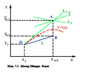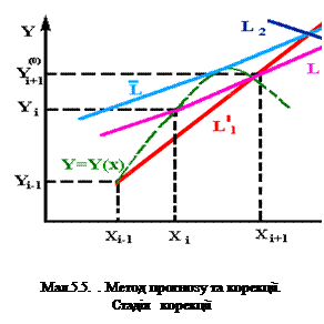 Алгоритм рішення рівняння методом прогноза та корекції слідуючий. По (5.16) обчислюється завбачене значення Y(0)i+1. Геометрично завбачення зводиться до того, що знаходимо кут нахилу дотичної в точці (Xi,Yi) (пряма L1 на мал. 5.4). Після цього через точку (Xi-1,Yi-1) проводиться пряма L’1, паралельна L1. Завбачене значення Yi+1 буде розташоване там, де пряма L’1 перетине з ординатою X=Xi+1.