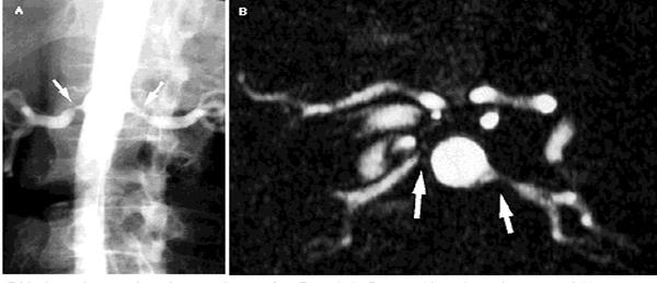 Б: стандартная ЯМР-ангиограмма на том же уровне обнаружила те же изменения (стрелки). (Рисунки Jonathan Kruskal, MD, PhD.)