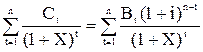 Розрахунок IRR проводять методом послідовних наближень величини NPV до нуля при різних ставках дисконту. Розрахунки проводять за формулою: