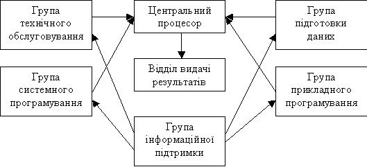 На базі великих ЕОМ створюють обчислювальний центр, що містить декілька відділів або груп (структура якого зображена на рис. 5.5). Штат обслуговування - десятки людей.