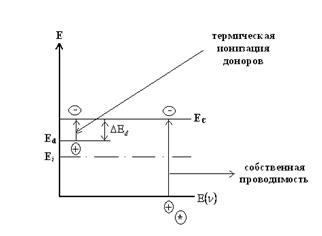При повышении T: доноры ионизуются и концентрация электронов будет равна концентрации ионизованных доноров.