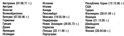 Организация экономического сотрудничества и развития (Organization for Economic Cooperation and Development, OECD) начала свою деятельность 30 сентября 1961 г. после ратификации Конвенции об образовании ОЭСР (Convention on the Organization for Economic Cooperation and Development), называемой также Парижской конвенцией, подписанной 14 декабря 1960 г. двадцатью государствами-учредителями. Остальные страны присоединились позже.