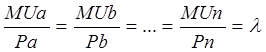 В точке касания выполняется правило равновесия потребителя представленное в кардиналистской теории как