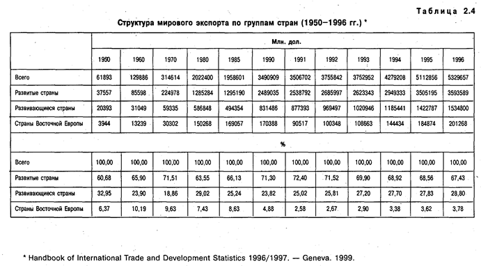 Особенности развития стран определяют и их роли в международной торговле. Доля промышленно развитых стран в мировом экспорте на протяжении последних 30 лет составляет около 70%. Такова же доля этих стран ив мировом импорте. Около 20—30% мировой торговли приходится на развивающиеся страны, но в каждой из этих групп происходят существенные изменения. В 90-е гг. доля промышленно развитых стран в мировой торговле постепенно сокращалась, а доля развивающихся стран (в основном азиатских) увеличивалась (табл. 2.4). Ведущие позиции в мировой торговле занимают США, Германия, Япония, Франция, Великобритания, Италия, Канада, Нидерланды, Бельгия, Люксембург. Среди развивающихся стран можно выделить Китай, Республику Корея, Гонконг, Тайвань, Сингапур, Малайзию, Мексику, Бразилию, Индонезию. В табл. 2.5 представлены основные страны-экспортеры и импортеры в 1996 г.