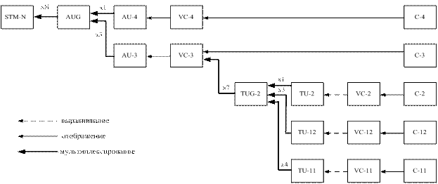 · C-n — контейнер n=1,2,3,4(уровни контейнера соответствуют уровням PDH);
