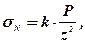 Нехай сила прикладена нормально до поверхні в точці О. Згідно теорії Буссінеска радіальні напруження sR в масиві, зумовлені дією сили P, можна визначити так: