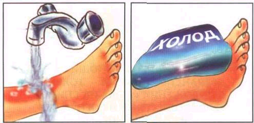 | Поставить под струю холодной воды на 10-15 минут | и/или | Приложить холод на 20-30 минут | Накрыть сухой чистой тканью | Поверх сухой ткани приложить холод | |||