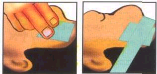 | ЗАФИКСИРОВАТЬ САЛФЕТКУ ПОВЯЗКОЙ И ОБЯЗАТЕЛЬНО ПРИКРЫТЬ ЭТОЙ ЖЕ ПОВЯЗКОЙ ВТОРОЙ ГЛАЗ ДЛЯ ПРЕКРАЩЕНИЯ ДВИЖЕНИЙ ГЛАЗНЫХ ЯБЛОК | ПРОМЫТЬ ГЛАЗ ПОД СТРУЕЙ ХОЛОДНОЙ ВОДЫ ТАК, ЧТОБЫ ОНА СТЕКЛА ОТ НОСА КНАРУЖИ | ||||