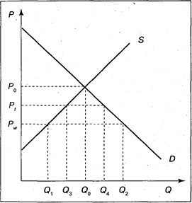 Предположим, что страна А открыла свои таможенные границы при мировой цене на яблоки, равной Рw. Поскольку эта цена ниже внутренней, то цены на внутреннем рынке упадут, производство яблок в стране А сократится с Qo до Q1 а потребление возрастет с Q0 до Q2 Потребление при сокращении производства будет расти за счет импорта, величина которого равна (Q2-Q1).