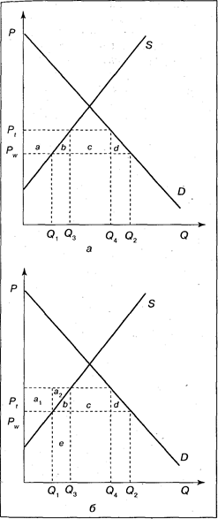 На рис. 5.2,б площадь, равная а, разделена на две части. Часть площади, обозначенная а1,представляет собой дополнительную выгоду производителей от реализации по цене P1 в условиях действия импортной пошлины такого объема товаров (в нашем примере — яблок), который был бы продан и в условиях свободной торговли (только по ценам Рw). Кроме того, как уже отмечалось, введение импортной пошлины приводит и к росту объема внутреннего производства с Q1, до Q3 Доходы от продажи этого дополнительного количества товара равны: (Q3— Q1)Pt, или, как обозначено на схеме, они составляют: Sa2+ Sb + Sc. Дополнительная выгода производителей, полученная вследствие расширения производства после введения импортной пошлины, равна Sa2 ,астоимость ресурсов, требуемых для этого расширения производства, — S (b + е). Если бы импортная пошлина не была введена, то это же количество яблок могло бы быть куплено на мировом рынке по цене, равной Se. Следовательно, стоимость ресурсов, направленных на расширение внутреннего (более дорогого по сравнению с мировым) производства яблок, а не на закупку дополнительного количества более дешевых яблок на мировом рынке или на использование в других секторах экономики, равна Sb.