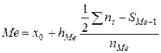 где х0 – нижняя граница медианного интервала (накопленная частота которого превышает половину общей суммы частот);