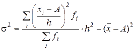 Для расчета дисперсии можно использовать способ отсчета от условного нуля, который позволяет упростить вычисления при больших значениях признака. Тогда дисперсия вычисляется по формуле: