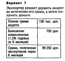 Экспортер, получивший в нашем примере акцептованную банком тратту, после сравнения возможных вариантов должен для себя решить, что лучше — 95 750 дол. сейчас или 99 250 дол. Через 6 месяцев.