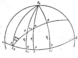 2. ортодромия пересекает меридианы под разными углами (А0 , А1 , А2),