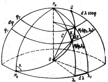 Возьмем на локсодромии две точки М1(j1, l1) и М2(j2, l2) (Рис. 1.8a), находящиеся на малом расстоянии одна от другой (dS). Из элементарного треугольника М1 М2 С (Рис.18.b) имеем: