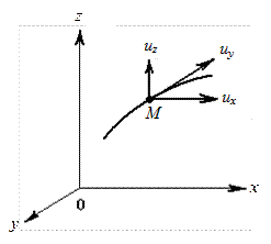 Для описания движения жидкости используется математическая модель. В гидравлике наибольшее распространение получила модель Эйлера, суть которой можно объяснить следующим образом. Предположим, что точка М движется по некоторой траектории в системе неподвижных координат. Мгновенное значение составляющих скорости вдоль осей координат будет зависеть от положения точки, т.е. от величины координат x, y, z и времени t. Для составляющих скоростей течения жидкости в рассматриваемой точке