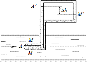 Через отверстие А происходит измерение динамического давления. Через отверстия М измеряется статическое давление жидкости. Жидкость под действием давления поднимается по соответствующим пьезометрическим трубкам до точек А¢ и М¢.