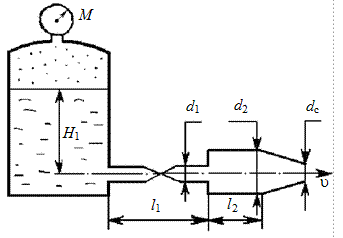 К закрытому резервуару, на свободной поверхности которого действует манометрическое давление рм= 500 кПа, подсоединен трубопровод переменного сечения с диаметрами d1 =