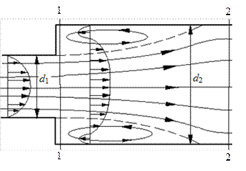 Как показывают наблюдения, поток, выходящий из узкой трубы, отрывается от стенок и дальше движется в виде струи, отделенной от остальной жидкости поверхностью раздела (см. рис. 4.14). На поверхности раздела возникают вихри, которые отрываются и переносятся далее транзитным потоком. Между транзитным потоком и водоворотной зоной происходит массообмен, но он незначителен. Струя постепенно расширяется и на некотором расстоянии от начала расширения заполняет все сечение трубы. Вследствие отрыва потока и связанного с этим вихреобразования на участке трубы между сечениями 1-1 и 2-2 наблюдаются значительные потери напора.