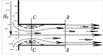 После сжатия в сечении С-С струя расширяется до сечения насадка и из насадка выходит полным сечением. В сжатом сечении С-С скорость потока выше, чем на выходе, а значит, давление в этом сечении меньше, чем при истечении из отверстия, когда давление равно атмосферному. Таким образом, в насадке создается вакуум и эффект «подсасывания», что увеличивает расход через насадок. Если резервуар открыт, а истечение происходит в атмосферу, то расход можно определить по той же формуле, что и для отверстия.