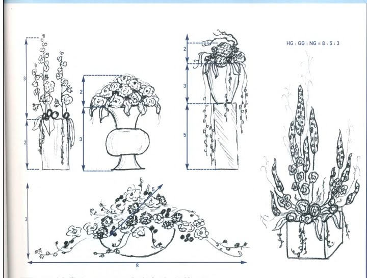 Во флористике применяют чаще всего соотношение 2:3, 3:5:8. Это означает, что, например, при размещении цветов в вазе на высоту вазы должно приходиться три части, на высоту цветов над вазой — пять частей и высота всей композиции составит восемь частей. Примерно так же должны соотноситься части в букете, который держат в руках.