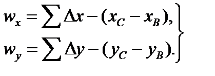 Здесь (Δх) и (Δу) – поправки в приращения координат, а wx и wy свободные члены (невязки), вычисляемые по формулам