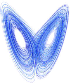 Для математического и графического описания детерминированного хаоса пользуются понятием, которое называется «аттрактор» (от английского глагола to attract – притягивать). Аттрактор – это множество траекторий, характеризующих установившийся процесс. Форма его траекторий очень сильно зависит от начальных условий. Примером такого аттрактора является аттрактор Лоренца (рис. 20).