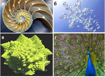 а) морская раковина; б) снежинка; в) капуста брокколи;