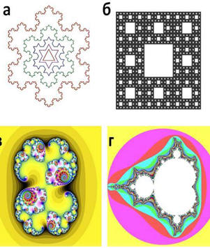 а) снежинка Коха; б) ковёр Серпинского; в) фрактал Жу-лиа; г) множество Мандельброта