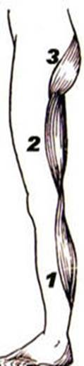 Рис. 29. Образец миотатической цепи, включающей икроножную мышцу (1), а также ишиокруральную (2) и ягодичную (3) мускулатуру