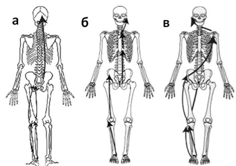а – дорзальная поверхностная миофасциальная цепь, б – вен-тральная поверхностная миофасциальная цепь, в – спиральная миофасциальная цепь