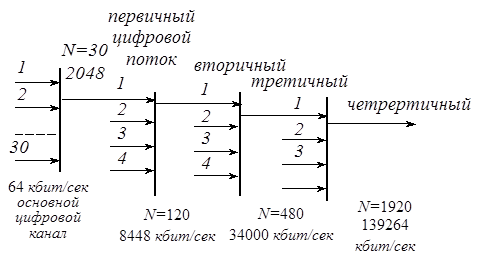 Данный принцип заключается в том, что в аппаратуре с ИКМ формируются первичные цифровые каналы со скоростью передачи 64 кбит/сек (т.к. применяется 8-разрядный код m=8 и частота дискретизации fg = 8 кГц). Такой канал называют основным цифровым каналом. Далее формируются цифровые потоки высших порядков.