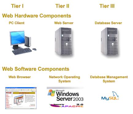 В первом слое (Tier 1) клиентский настольный ПК выполняет работу интерфейса пользователя системы; во втором слое (Tier 2) сервер Web выполняет основные функции системы по обработке; и в третьем слое (Tier 3) сервер базы данных, и в некоторых случаях медиа-сервер, осуществляет требуемые системе функции хранения и извлечения информации.