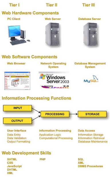 Рассмотрение Web как трехслойной, клиент/серверной системы обработки информации имеет важные последствия для разработки приложений Web. Вчерашний "создатель страницы Web" становится сегодня "разработчиком системы Web". Теперь недостаточно иметь пакет разработчика, состоящий из редактора WYSIWYG и базовых навыков XHTML. Необходимо стать широко образованным в более разнообразном множестве технологий. Внизу на следующей расширенной схеме трехслойной системы указаны некоторые навыки и инструменты, необходимые для проектирования и программирования систем на основе Web, которые обслуживают деятельность по обработке информации.