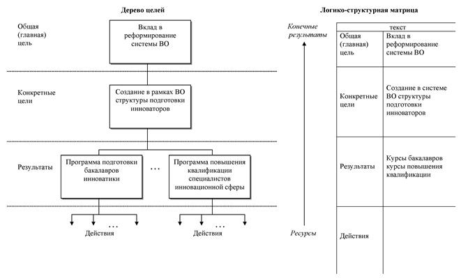 Для приведенного выше примера, можно предложить в качестве основных действий проекта подготовку и предоставление новых курсов; в качестве ожидаемого результата - наличие разработанных и принятых Министерством образования учебных программ, дающих степень бакалавра инноватики; в качестве конкретной цели - создание в системе высшего образования структуры обучения инновационной деятельности, что ведет к достижению общей цели проекта, т.е. вкладу в реформирование системы высшего образования.