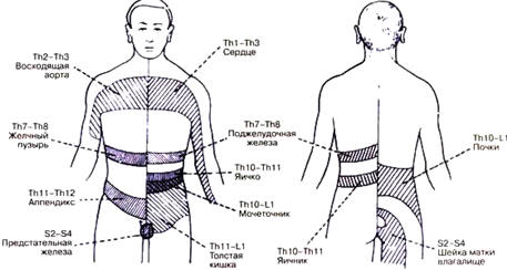 Рис. 84. Примеры преимущественно местных (проекционных) болей при патологии внутренних органов, соответствующих законам сегментарно-метамерной иннервации [147]