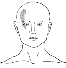 Рис. 85. Пример «атипичной» реперкуссионной боли в правой лобной области, описанный Г.И. Маркеловым, у больного во время приступа печеночной колики [138, 146]