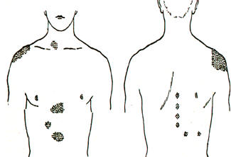 Вторая категория симптомов носит название отраженных или реперкуссионных [138, 139, 140]. В отличие от предыдущей группы, их происхождение далеко не столь очевидно, так как они не подчиняются законам сегментарно-метамерной иннервации. Эти симптомы гораздо менее специфичны. В общем, для них характерно, что патологические изменения при заболевании органов грудной клетки и верхнего этажа брюшной полости проявляется в области шеи, ключицы, правой или левой руки (в зависимости от стороны локализации органа), в межлопаточном и подлопаточном пространстве. При заболеваниях среднего или нижнего этажа брюшной полости и органов малого таза они обнаруживаются на животе и в поясничном отделе, а при патологии гениталий - в области паха и на внутренней поверхности бедер [53].