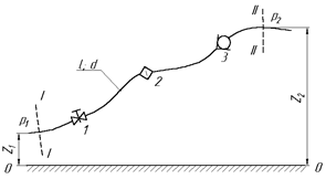 Для простого трубопроводу сталого перерізу довжиною l, (рис.6.1) що має ряд місцевих опорів (наприклад, вентиль1, фільтр 2, зворотній клапан 3 і т.д. ), основним розрахунковим рівнянням є рівняння Бернуллі для початкового І і кінцевого ІІ-го перерізів трубопроводу. При α1=α2 і υ1=υ2 воно має вигляд: