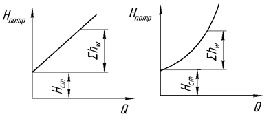 – це характеристика трубопроводу, зміщена вздовж осі ординат на величину Hcm (рис.6.3а – при ламінарній течії, рис. 6.3б – при турбулентній).