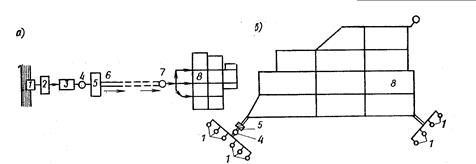 7. Споруди для зберігання і акумулювання води – водонапірна башта 7, яка виконує ту ж роль, що і резервуар чистої води. При розташуванні башти за схемою рис. 7.1а систему називають системою водопостачання з баштою на початку мережі; при розташуванні за схемою рис. 7.1б – системою водопостачання з контррезервуара.