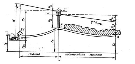 – сума втрат напору в мережі при максимальному водозаборі на ділянці від водонапірної башти до диктуючої точки А.