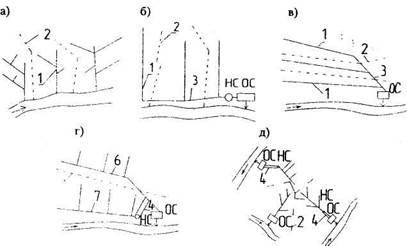 а) перпендикулярная схема (рис. 6.2, а) — коллекторы бассейнов канализования трассированны перпендикулярно направлению воды в водоеме. Данная схема, в основном, применяется для сброса в водоем атмосферных сточных вод;