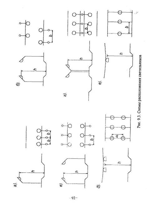 Схемы а-г предполагают установку светильников на консолях опор наружного освещения; д-е - подвеску светильников на тросе.
