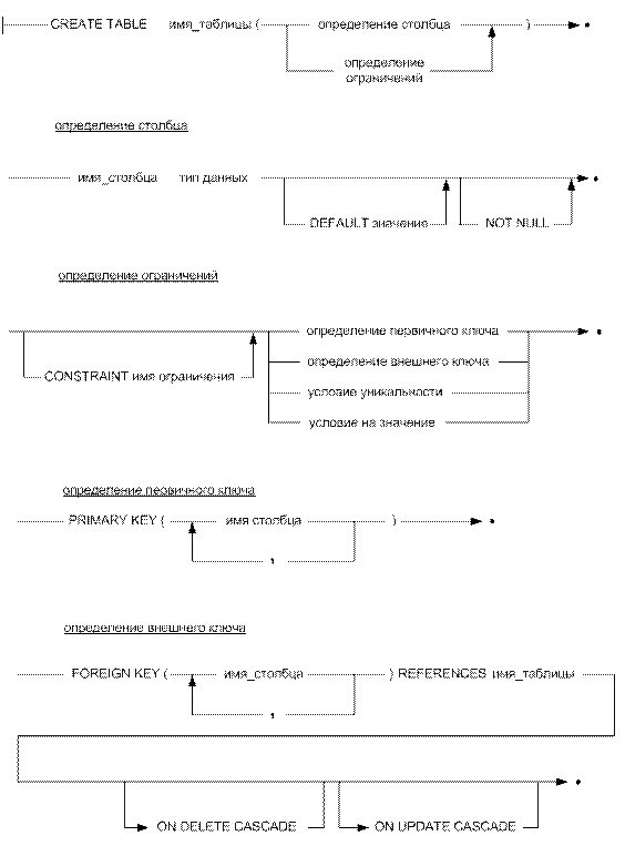 В стандартном SQL правил удаления, как и правил обновления всего четыре: RESTRICT, CASCADE, SET NULL и SET DEFAUL. Однако правила SET NULL и SET DEFAULT некоторыми СУБД вообще не поддерживаются, а правило RESTRICT не нуждается в явном указании, так как в большинстве случаев принимается по умолчанию. На синтаксической диаграмме для наглядности задания инструкции CREATE TABLE включено правило каскадного обновления (ON UPDATE CASCADE).